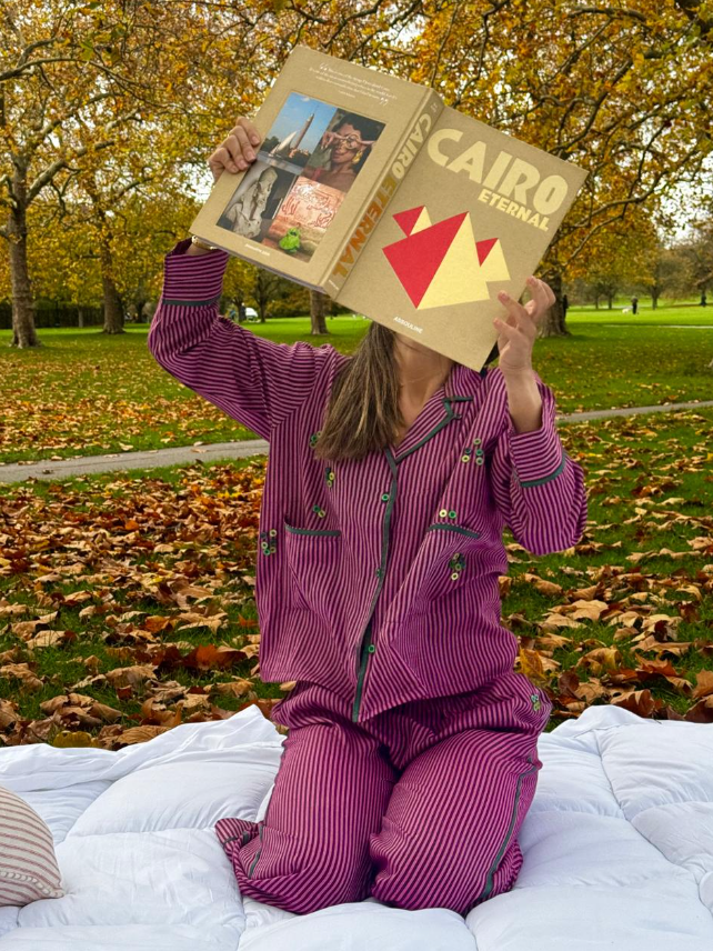 Introducing The Cairo Set, your striped companion for lazy nights and spontaneous adventures alike. Throw it on for bedtime comfort, then transform it with a statement heel and structured coat for a confident walk through Zamalek's vibrant streets. One set, infinite possibilities. With contrast piping, roomy pockets, and tiny embroidered details (your new favourite part), this set isn’t just sleepwear… it’s a mood. Wear it for breakfast in bed, Zoom calls you didn’t emotionally prepare for, or those magical hours between waking up and actually getting out of bed.