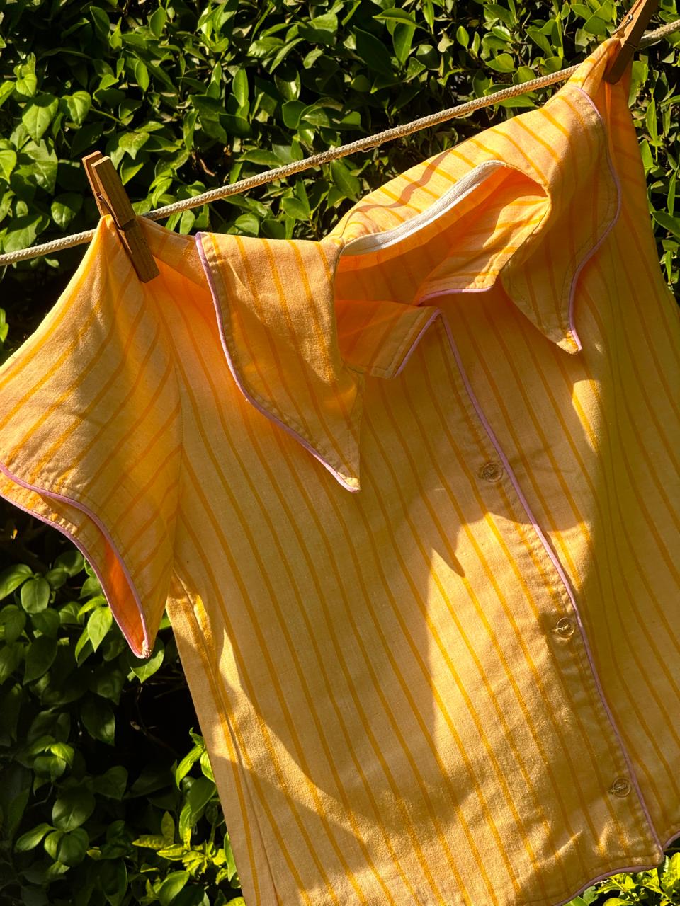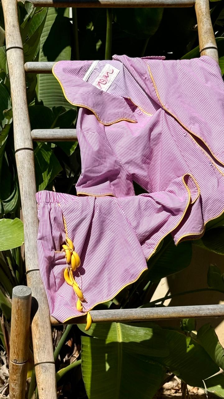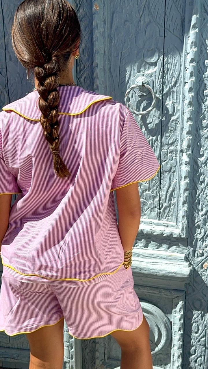 Embrace your playful side with The Ghalia Set, a vibrant Egyptian cotton pajama set designed for the funkiest girl. Featuring bold stripes in two lively color combos—orange and pink or pink and yellow—this short sleeve set brings comfort and cool vibes to your loungewear. Perfect for carefree nights in or relaxed weekends, it’s your go-to for relaxed style with a splash of personality.