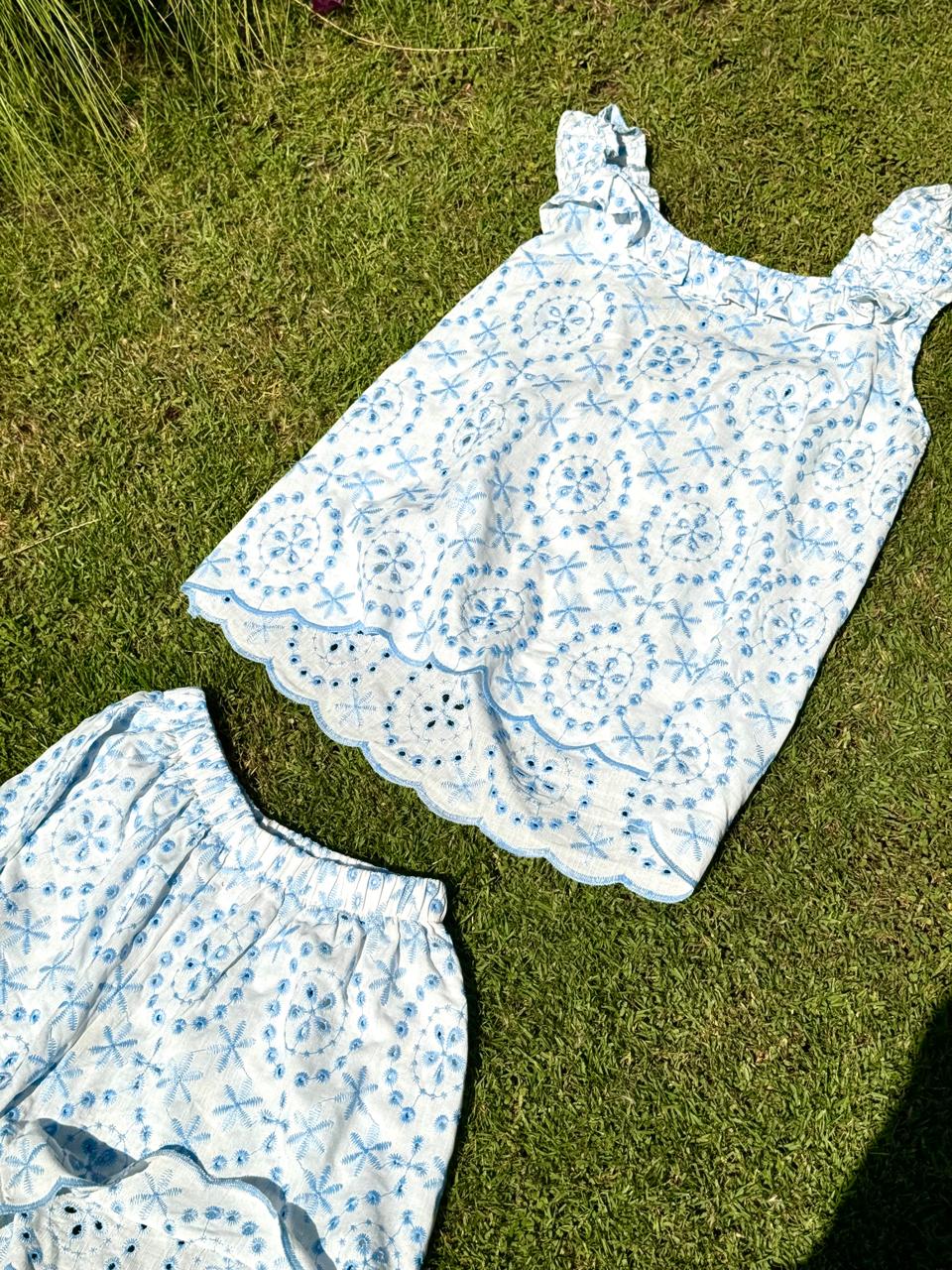 Wrap yourself in the cozy charm of The Sulaima Set, made from soft organic Egyptian cotton. This white pyjama set, adorned with delicate blue embroidery, is perfect for dreamy nights and stylish enough to wear outside. Embrace comfort and a touch of whimsy in your day-to-night routine!